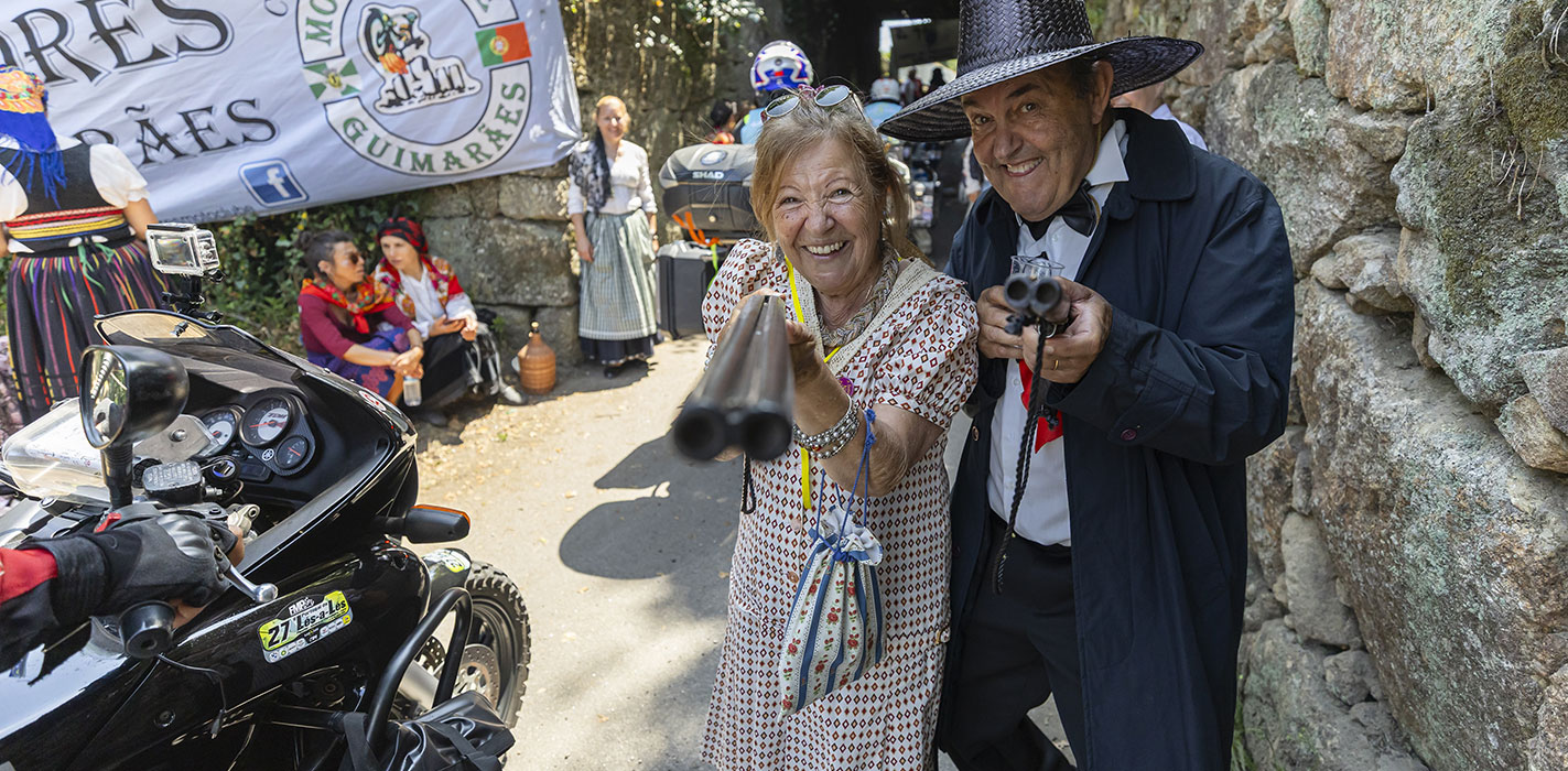 Da Capital do Calçado rumou a norte a enorme caravana internacional, aproveitando as paragens no santuário de São Torcato, no castelo de Póvoa de Lanhoso ou na praia fluvial de Adaúfe, para comer o primeiro de vários reforços ao pequeno-almoço entregue pela organização em Felgueiras. Momentos para digerir - além de requintada lista de doçaria, sanduíches, sumos, enchidos, café, e muitas outras ao nivel de hotel de 5 estreslas... - as primeiras emoções de uma viagem sempre ladeada por paisagens verdejantes, da descida ao Rio Vizela à sinuosa subida a Guimarães. Mas passando ao lado da histórica cidade em direção a S. Torcato e ao enorme templo cuja demora na construção justifica a profusão de estilos, do neoclássico, gótico, renascentista e romântico. Espaço onde o MC Conquistadores de Guimarães montou espetacular controlo de passagem, superando mesmo o elevado nível da produção apresentada em 2018 no castelo de Montalegre. Depois da uma boa mão-cheia de agradáveis curvinhas, a primeira grande surpresa do dia levou muitos participantes a esfregar os olhos de espanto, tal era o 'teatro' armado pelos Conquistadores. Estariam bem acordados? Um controlo que, sem exagero e antes a pecar por defeito, fica na história do Lés-a-Lés, com príncipes e princesas, serviçais e feirantes, ciganos e bispos, emigrantes preparados para fugir 'a salto' da miséria que grassava em Portugal na década de 1960, um quarto de dormir decorado a preceito segundo os cânones de outros tempos, com toda a família em pijama e até o penico. E sem esquecer o temível Zé do Telhado que, armado de imponente pistolão, ditava leis para um estacionamento perfeito das muitas motos que ali se acumularam.